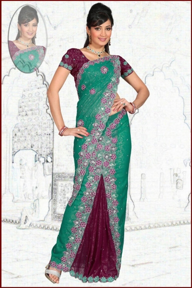 Magenta and Sea Green embroidered party pre-stitch saree intricate with stone, sequins, cut dana, moti, resham thread, moti ring, cut Work, diamond and border work.This saree is coupled with match blouse.