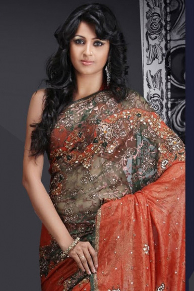 Orange embroidered wedding saree intricate with resham, sequins, stone, cut dana, net patch, diamond.This saree is coupled with match blouse.