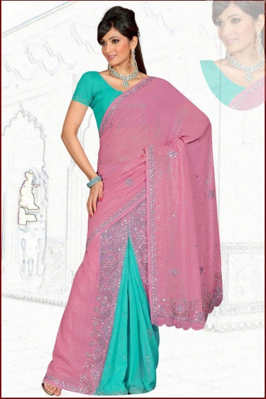 Pink and Sea Green embroidered party pre-stitch saree intricate with stone, sequins, cut dana, moti, resham thread, moti ring and border.