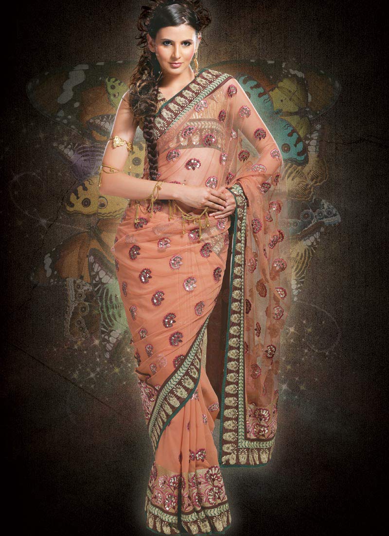 Achieve a pleasing look with this pleasing peach saree with dark green and coffee brown patch along the border that features sequins and zari embroidered motifs. The lower part of the saree flaunts sequins and resham embroidered floral design along with sequins stripes.