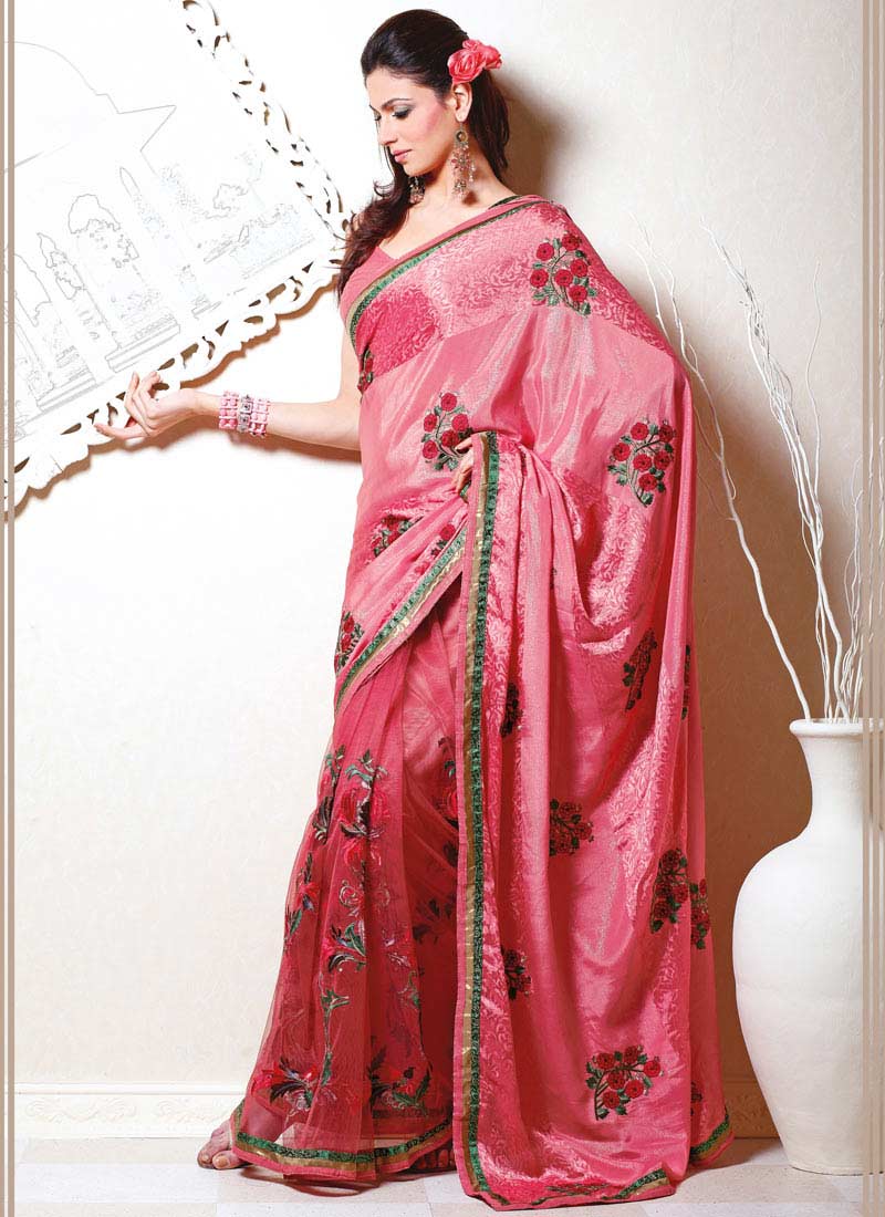 Onion pink shade saree featuring resham embellished floral patterns along the lower part. Border is accentuated with multiple fancy patch borders.