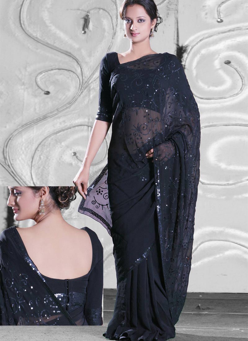 A simple black saree that renders a stunning impact. Black saree with black sequins along the border. Pallu is sparkled with black sequins, stones and resham embroidered floral design.