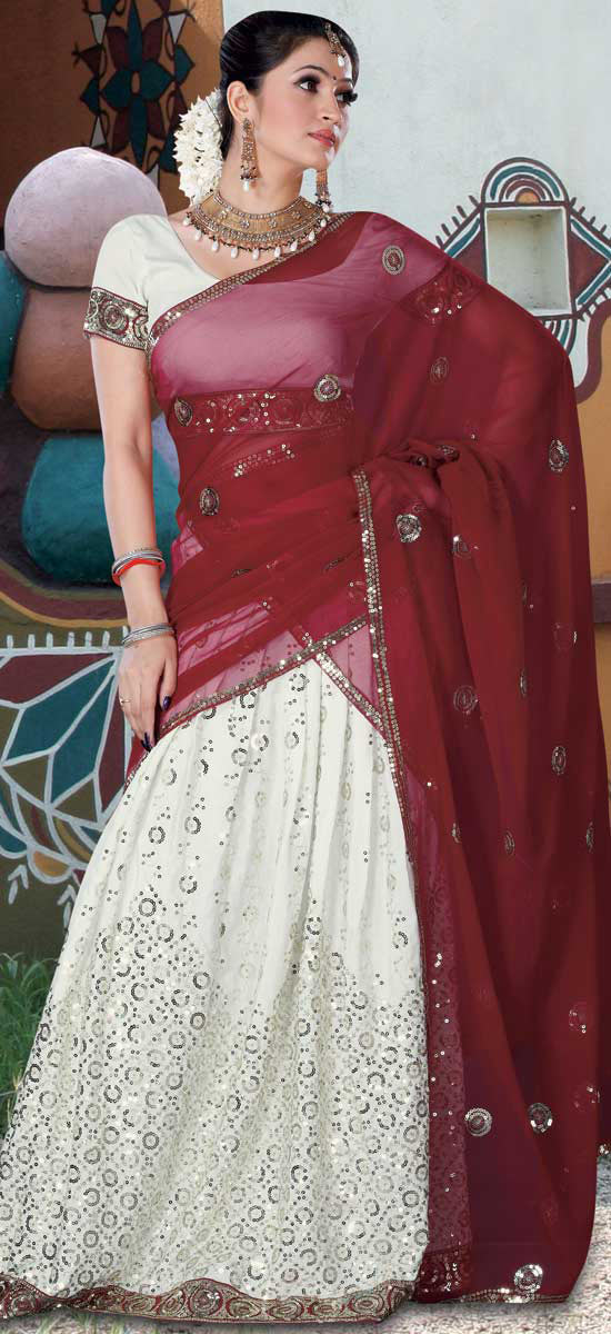 Latest designer viscose georgette half saree (pavadai davani) with intricate floral embroidery work in resham thread, stones and sequins work all over.
