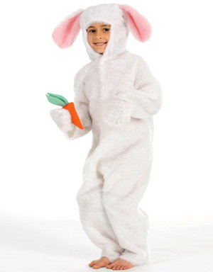 Kids with a twitchy little noses, kids who like carrots - or maybe just kids who like rabbits - will love this great white rabbit costume! The one-piece jump suit is made from a white imitation fur material and comes with a bobtail incorporated, along with a pair of mittens and a pair of pink floppy ears on the hood.
