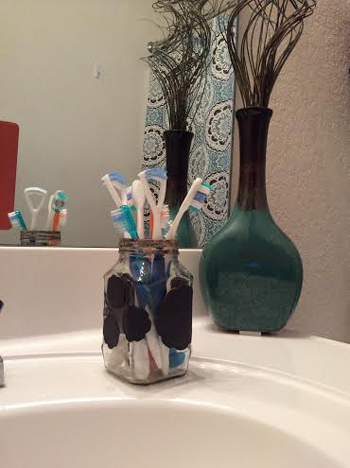 I cleaned the bottle, peeled the bottle clear of the label and sticky glue. While it was drying well, i drew patterns similar to those on my shower curtain with a pencil on the brown paper. Once the patterns were cut, i pasted them on the dry bottle using the strong glue ( can be Mod-podge or any strong glue). After they stuck well to the bottle surface and dried, i also painted them with a matching brown oil color ( inorder to stop the paper from color fading ). At this stage, the bottle needs to be set aside for a couple of days as oil color takes longer to dry. Last step is to coat the patterns with Mod-podge to give them a glossy and water-resistant finish., i initially tried coating them with clear nail polish but that couldnot stand the constant water spills from the tap. And atlast that coffee jar is ready to hold tooth brushes and goes well with my Guest bath decor too. No one new it was home decorated. You can transform the other glass jars in your stock into pencil, utensil, paint brush, sketch pen holders....go ahead now !!!