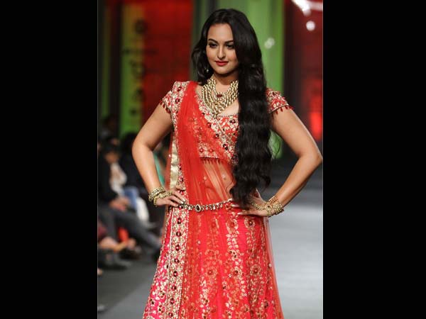 Red is the traditional colour for a bride. Sonakshi Sinha wears a red bridal outfit in contemporary style.
