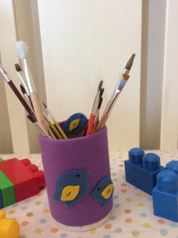 First i removed the label paper from its surface, then i had cut open the lid to create an open container look. Next i started cutting the base felt piece into the necessary dimensions and applied glue to the container base...giving it a few seconds, i laid the purple felt piece on the glued surface without any creases. Then i had cut two other colors of felt pieces in desired shapes and used hot glue gun to stick them as felt - on - felr doesn't stick with ordinary liquid glue. You can use decorative ribbons to finish the edges, but i left it to showcase its original look. Use it as pencil or paint brush holder..due to its light weight, its purpose is limited but it is perfect as a gift to a child.